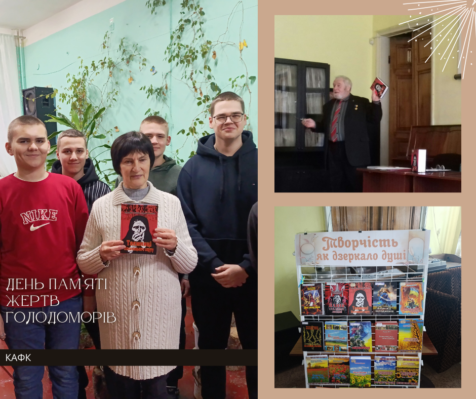 Найтрагічнішим та найжахливішим за наслідками став масовий голод 1932-1933 рр. Загиблі вшановуються хвилиною мовчання, а по всій країні проходить захід під назвою «Свічка пам’яті». Факти Голодоморів, спричинених радянською владою на чолі з Й. Сталіним, визнані цілеспрямованим геноцидом української нації як на національному, так і на міжнародному рівні. Тоталітарний радянський режим планомірно винищував український народ, про що свідчать численні історичні докази. У 2025 році День пам`яті жертв Голодоморів відзначається 22 листопада. На базі Кіровоградської обласної бібліотеки для юнацтва імені Є. Маланюка викладачка Леся Якубська разом зі здобувачами освіти групи А 252 спеціальності «Агроінженерія» відвідали презентацію книги Валентина Карпова та Сергія Лисенка «Таємниці більшовицького спруту». Це документально-художнє видання з ілюстраціями про окремі моменти прихованої історії більшовицької партії. Присутні мали змогу послухати спогади, історичні факти про геноцид і лінгвоцид, народні перекази про жахливі події минулого. Письменники презентували видання з автографами, яке студенти урочисто вручили бібліотеці рідного коледжу.