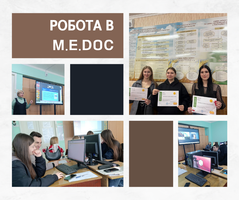Під час навчальної практики здобувачі освіти виконували практичні завдання безпосередньо в програмі M.E.Doc: формували податкові декларації, здійснювали перевірку звітності, опановували алгоритми її подання до контролюючих органів. За результатами виконання практичних завдань здобувачі освіти отримали сертифікати, що підтверджують набуті компетентності у сфері електронного документообігу та податкової звітності.