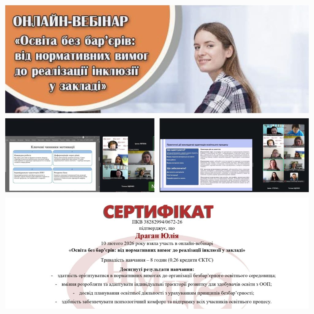 Участь у вебінарі стала важливим кроком у підвищенні професійної компетентності та впровадженні сучасних підходів до організації інклюзивного навчання в нашому коледжі. Отримані знання та практичні рекомендації сприятимуть подальшому вдосконаленню освітнього середовища відповідно до принципів доступності, рівності та поваги до кожного здобувача освіти.