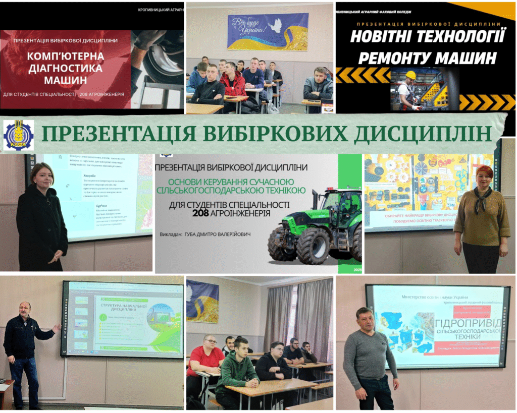 Нещодавно для здобувачів освіти третього курсу спеціальності Агроінженерія Кропивницького аграрного фахового коледжу викладачами циклових комісій професійно-орієнтованих, спеціальних та економічних дисциплін проведено зустрічі, на яких презентовано вибіркові дисципліни. Завідувачка навчально-виробничою практикою Юлія Драган разом із завідувачем відділення «Механізації сільського господарства» Олександром Маменком детально ознайомили студентів із процедурою формування переліку та подальшого вибору студентами навчальних дисциплін з циклу вільного вибору. Викладачі у вигляді відеопрезентацій ознайомили здобувачів освіти з метою, завданням, компетентностями, знаннями та вміннями, які вони здобудуть після вивчення дисциплін та структурою курсу.