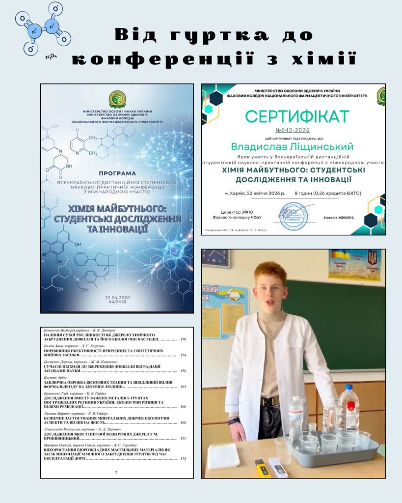 Здобувач освіти Кропивницького аграрного фахового коледжу Владислав ЛІЩИНСЬКИЙ взяв участь у Всеукраїнській дистанційній студентській науково-практичній конференції з міжнародною участю «Хімія майбутнього: студентські дослідження та інновації», яка відбулась 22 квітня 2026 р. на базі фахового коледжу Національного фармацевтичного університету м. Харкові.