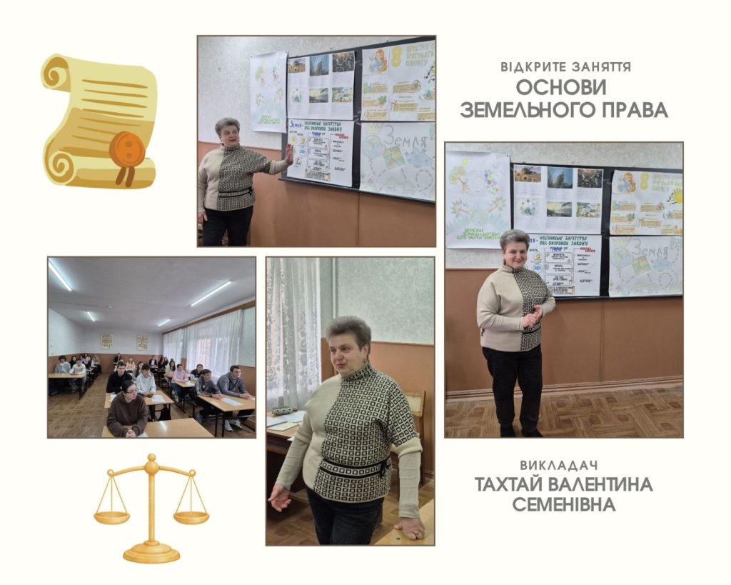 У коледжі відбулося відкрите заняття з Основ правознавства на тему «Основи земельного права», яке провела викладач КАФК Валентина ТАХТАЙ у групі Б-241. Заняття пройшло у форматі активного діалогу: здобувачі освіти не лише ознайомилися з нормами земельного законодавства України, а й спробували себе у ролі власників земельних ділянок, аналізуючи реальні життєві ситуації. Особливу зацікавленість викликало обговорення практичних кейсів, що дозволило краще зрозуміти, як працює право в повсякденному житті.