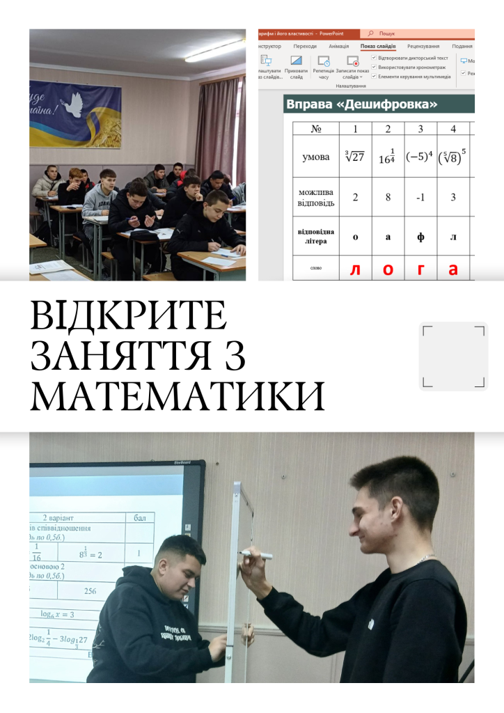 В межах виконання індивідуального плану викладача та пошуку нових напрямків удосконалення педагогічної майстерності Ірина КОНДРАТЕНКО на початку листопада провела відкрите заняття з математики за темою “Логарифми та їх властивості”.
