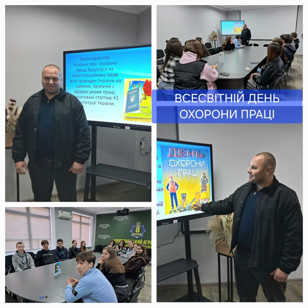 У Кропивницькому аграрному фаховому коледжі для здобувачів освіти групи К241 викладачем Косовим В.О. було проведено інформаційно-просвітницький захід, присвячений Всесвітньому дню охорони праці, який щорічно відзначається 28 квітня. Метою презентації стало формування у студентів свідомого ставлення до безпеки праці, розуміння ризиків професійної діяльності та важливості дотримання правил охорони праці.