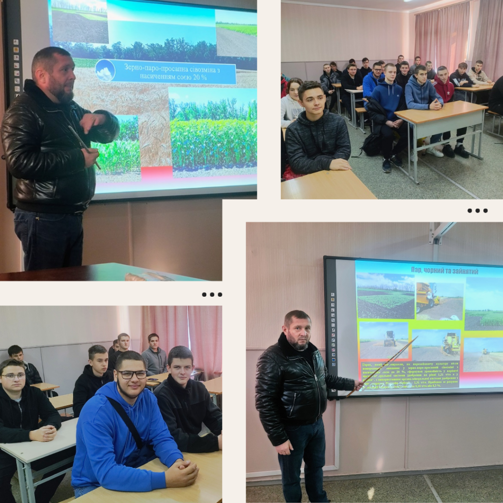 У Кропивницькому аграрному фаховому коледжі відбулося зустріч-лекція у рамках гуртка «Основ землеробства і тваринництва» на тему “Продуктивність та економічна ефективність вирощування пшениці озимої у різних сівозмінах залежно від системи удобрення та біопрепаратів”. Зі своєю доповіддю виступив завідувач науково-технологічного відділу збереження та родючості ґрунтів Інституту сільського господарства Степу НААН, кандидат сільськогосподарських наук Мащенко Ю.В. На заході були присутні здобувачі освіти груп М223 та М221. Лекція викликала жвавий інтерес серед студентів та сприяла поглибленню їхніх знань у сфері аграрних технологій.